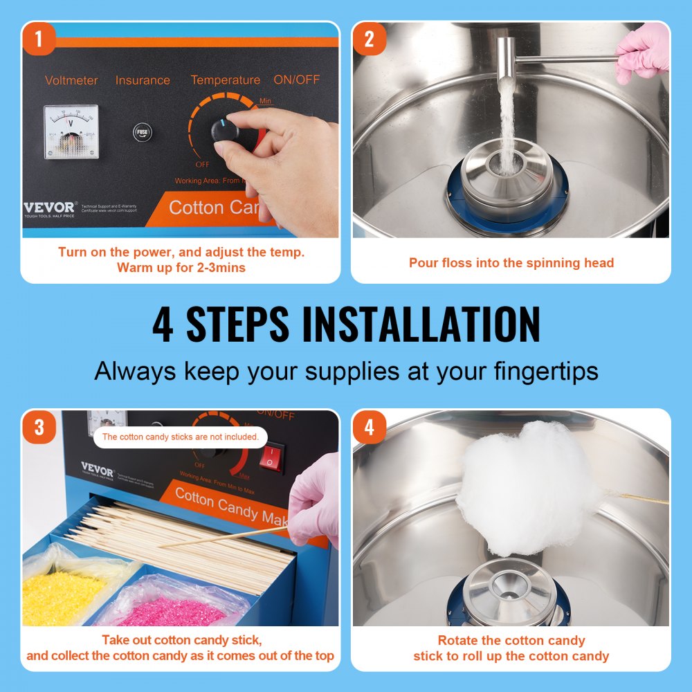 Experience the joy of making cotton candy with the VEVOR electric cotton candy machine Engineered for ease of use, this machine produces delicious, fluffy confections in just minutes Boasting a robust 1000W motor, it heats up swiftly and can create up to six cotton candies every minute Perfect for both personal and professional settings, it guarantees reliable results for sweet enthusiasts This model is not only efficient but also designed for quick and easy cleaning, making it an excellent choice for any occasion.