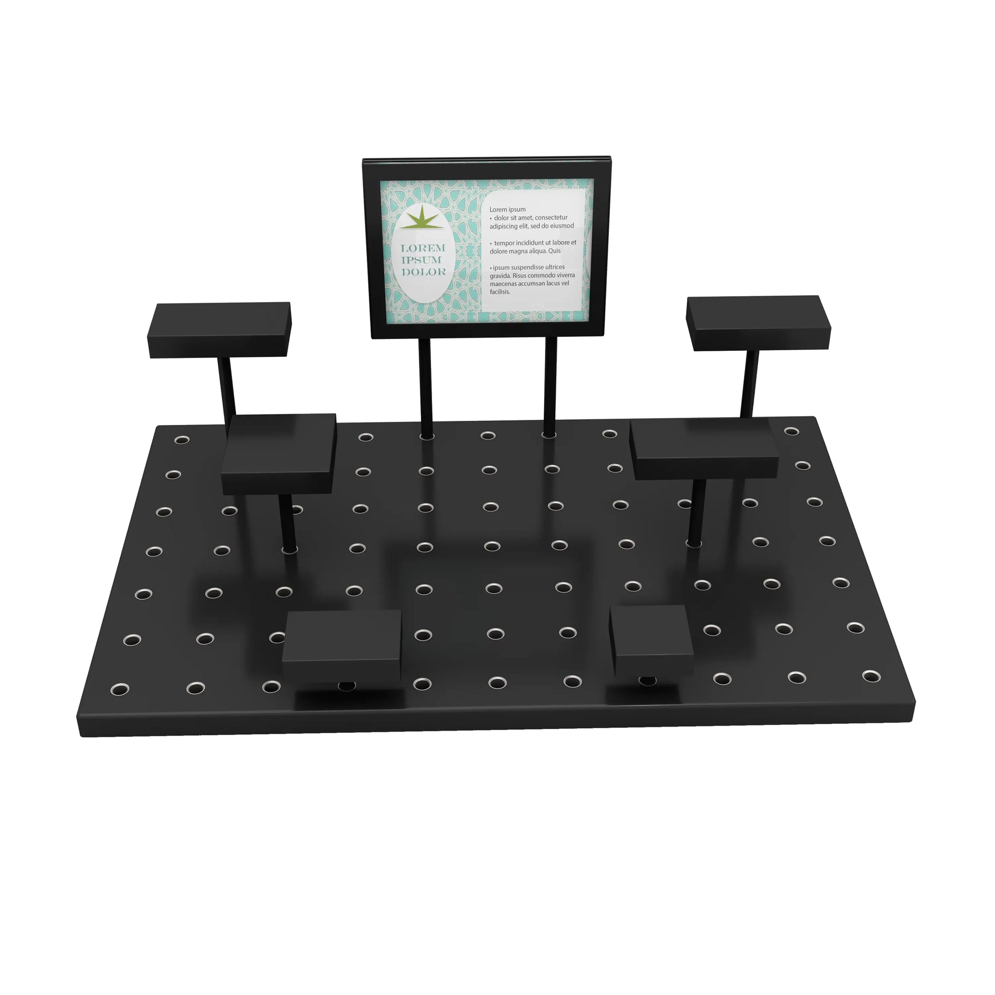 • Our high gloss black is heavy enough that it won’t move around while customers are looking at your merchandise. The base has 77 threaded display holes in a 7 x 11 grid pattern for easy placement of the six threaded stems giving you many options of where to place each display riser platform. You get two mounting stems that measure 2-3/8” H, two that measure 4-3/8” H and two that measure 6-3/8” H. Each stem is 3/8” in diameter.
