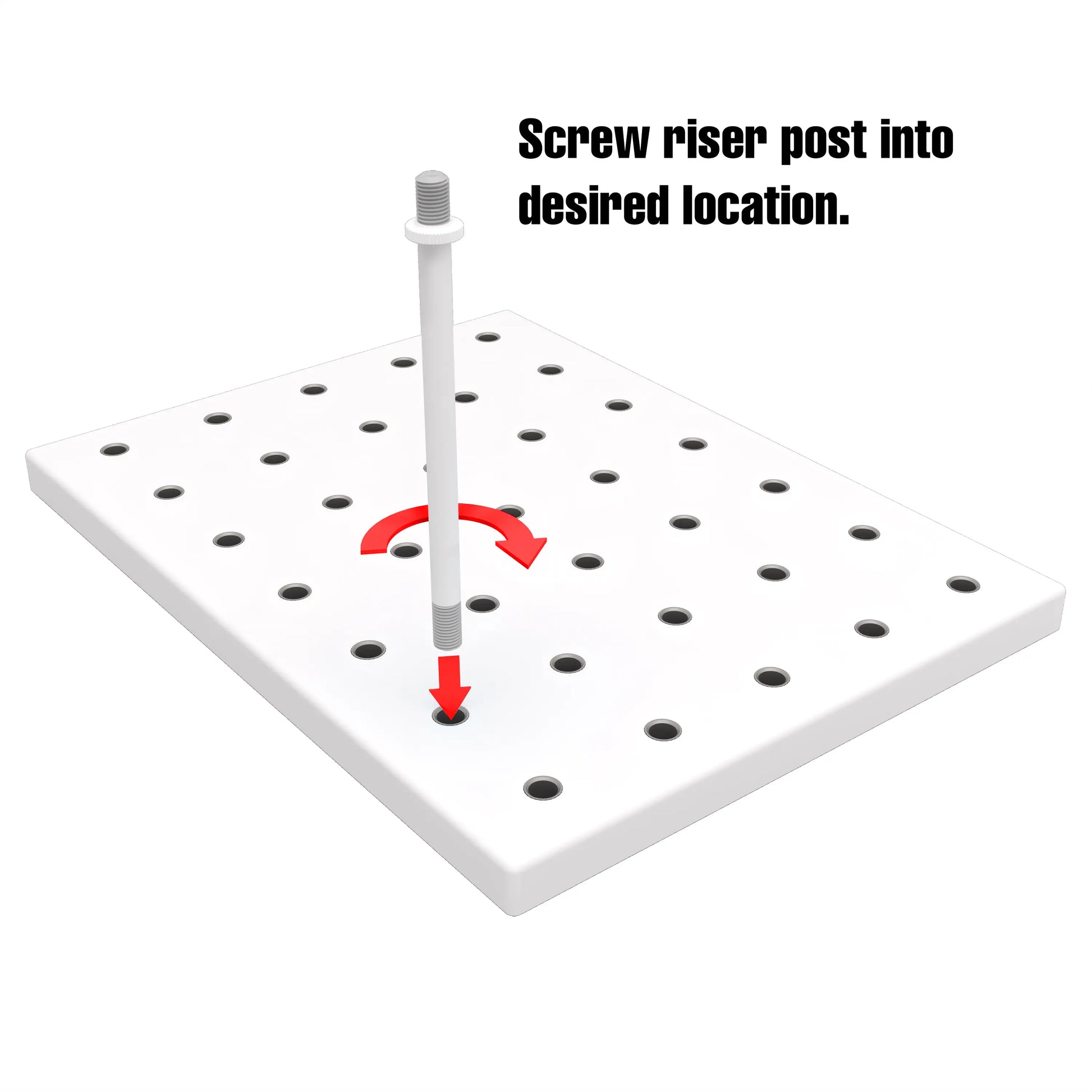 • Our high gloss black finish is elegant in any retail environment. The base measures 10-1/2” x 14” x 15/16” thick and weighs in at almost 8 pounds so it’s heavy enough that it won’t move around while customers are looking at your merchandise. The base has 35 threaded display holes in a 7 x 5 grid pattern for easy placement of the six threaded stems giving you many choices of placement of each display riser. You get two mounting stems that measure 2-3/8” H, two that measure 4-3/8” H and two that measure 6-3/8” H. Each stem is 3/8” in diameter.
