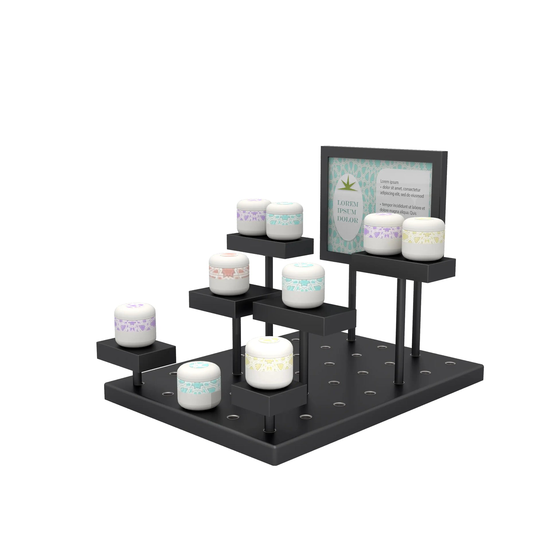 • These small multi-tiered riser displays in a gloss black finish are so easy to use to create a unique display over and over again, you will never run out of uses for it. Easily move each display tier when needed. Display small merchandise in a variety of ways.