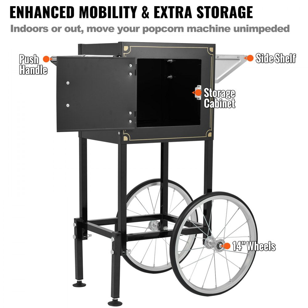 Transform your snack experience with this commercial popcorn popper, complete with a convenient cart for mobility Designed to replicate the ambiance of a classic cinema, it boasts internal LED lighting for a bright view of the popping process With a robust 850W power capacity and an 8 oz kettle, this machine can churn out an impressive 48 cups of popcorn, equivalent to around 384 ounces, in a single batch.