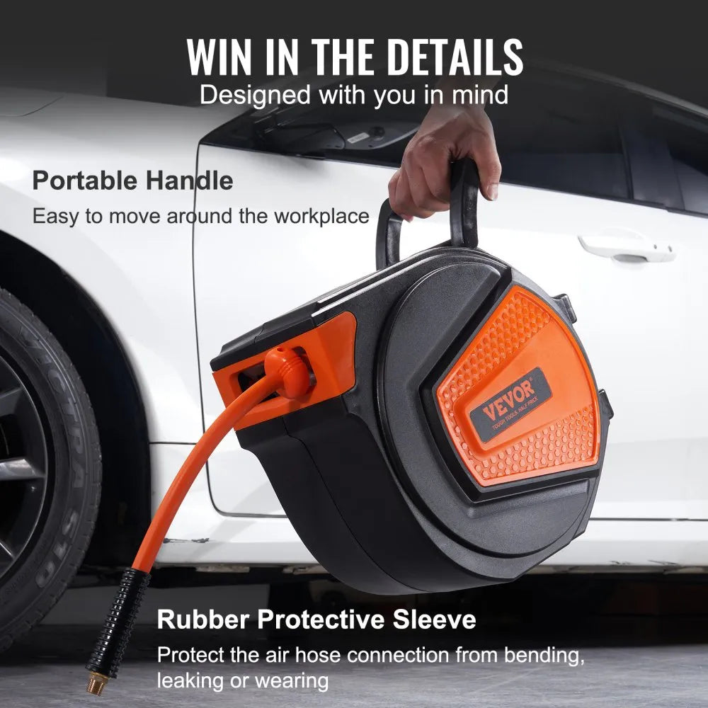 Experience convenience in your workspace with the VEVOR Retractable Air Hose Reel This smartly designed reel efficiently stores a 50-foot air compressor hose, keeping it untangled and well-organized Ideal for both home and commercial settings, it helps optimize your area for enhanced productivity With a 180-degree swivel mount, this reel is easy to install on walls or ceilings, allowing you to access the hose effortlessly for a variety of tasks.