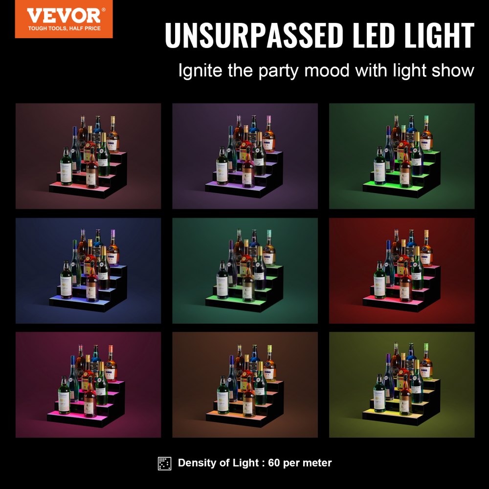 Illuminate your space with a vibrant multicolor LED lighting system designed for your bar or club This illuminated liquor bottle shelf offers enhanced brightness and a consistent lighting effect, elevating your ambiance It utilizes radio communication for remote control, allowing you to effortlessly adjust colors and modes from a distance Unlike other products, our shelf supports app control via your smartphone, letting you customize the display settings directly from your device.