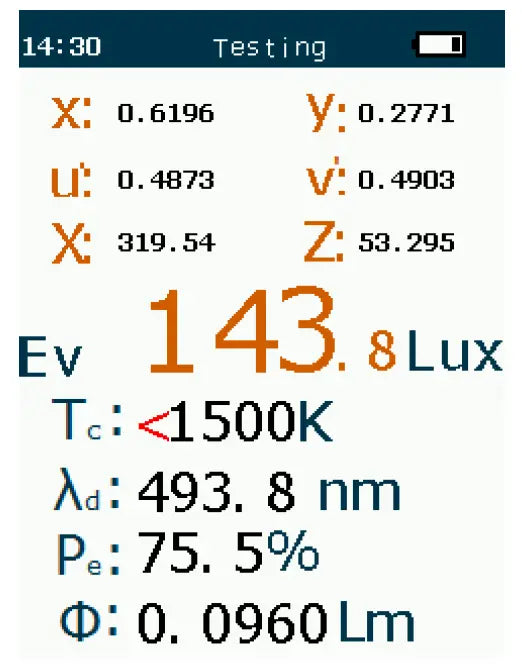 | Measurement functions | Tristimulus values: XYZ, Chromaticity: Ev xy, Ev u'v', Correlated colour temperature: Tc, Colour difference: Δ (XYZ), Δ (Evxy), Δ (Evuv), ΔE v ΔTc Δuv, Chromaticity coordinates: ICE1931 (x, y), ICE1976 (u, v), Dominant wavelength: λd, Colour fastness: Pe, Luminous flux: Φ, RGB parameter, colour chart, maximum recording and indicator |
