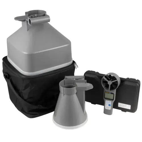 Data is easily interpreted on a two-line LC display, which showcases maximum, minimum, and average values, facilitating thorough analysis of the environmental conditions This set comes complete with two volumetric flow hoods that are compatible with both round and square duct exits or inlets, making it the perfect tool for maintaining ventilation and air conditioning systems.