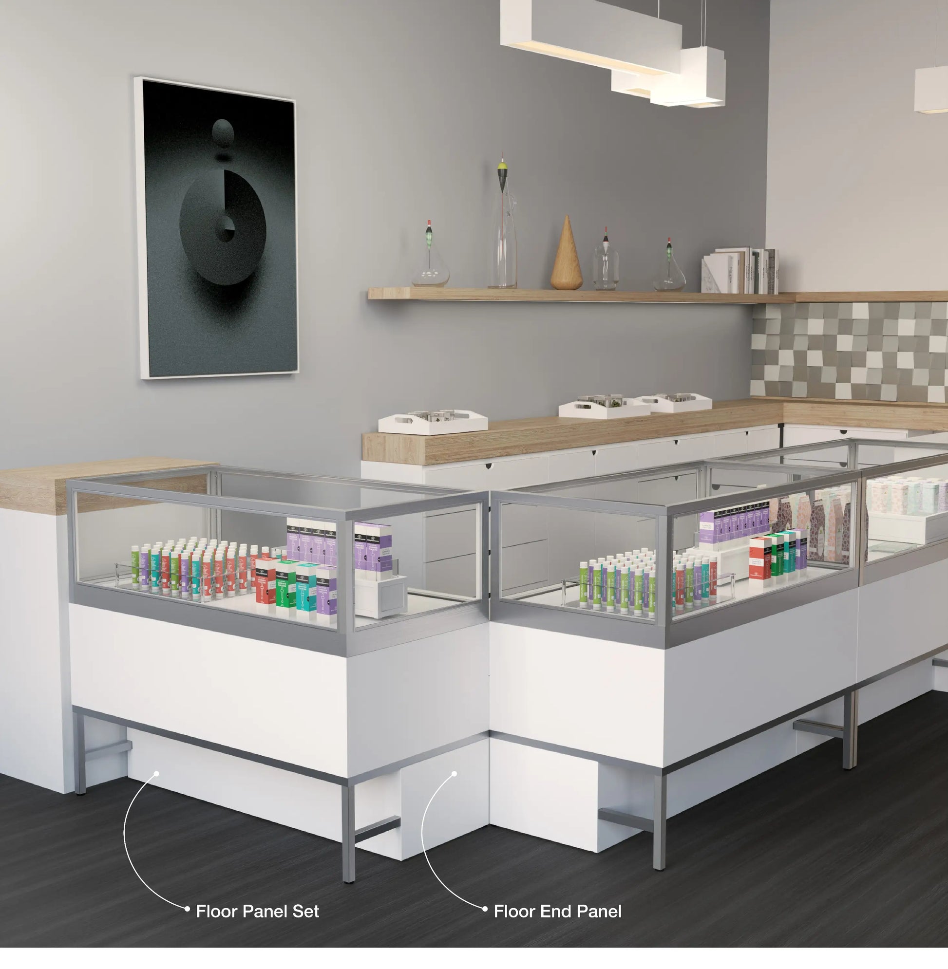 • The privacy panels are available in finishes that match perfectly to the showcase or you can choose contrasting finishes. You have a choice of a bottom center panel or bottom end panels or both. These panels easily mount to the legs of our existing Cannabis Display Storage Cabinet with minimal effort.