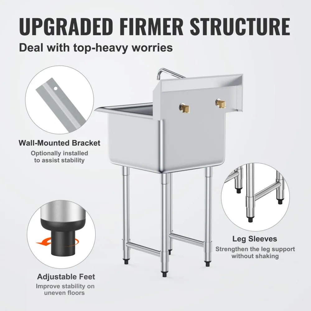 Experience the durability and efficiency of the VEVOR stainless steel prep sink, crafted from premium stainless steel that guarantees long-lasting performance and leak resistance With expertly designed corners featuring perfect welds, this sink effectively prevents any water from escaping, making it a robust choice for commercial environments