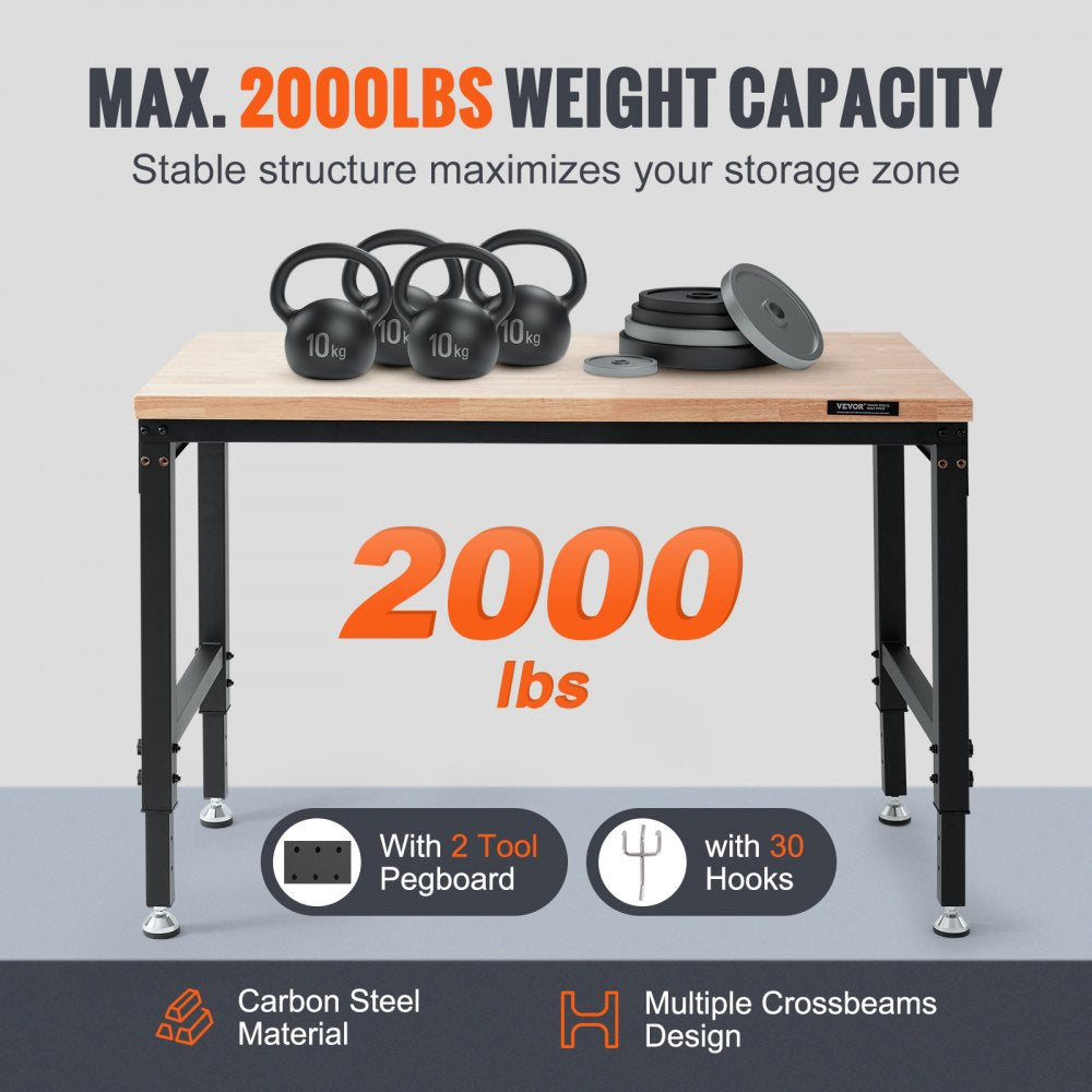 Introducing the VEVOR Adjustable Workbench, a sturdy worktable crafted for your garage needs Measuring 48 inches long and 24 inches wide, this workbench features a height adjustment capability ranging from 28 to 395 inches, allowing for customized comfort during use With an impressive load capacity of 2000 lbs, it can handle various projects with ease