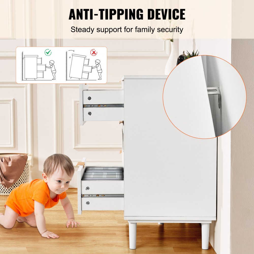 Additionally, the safety-conscious design includes an anti-tip device, and the smooth metal drawer sliders ensure effortless access to your items This dresser seamlessly blends with various interiors, providing stylish storage while making your essentials easily reachable.