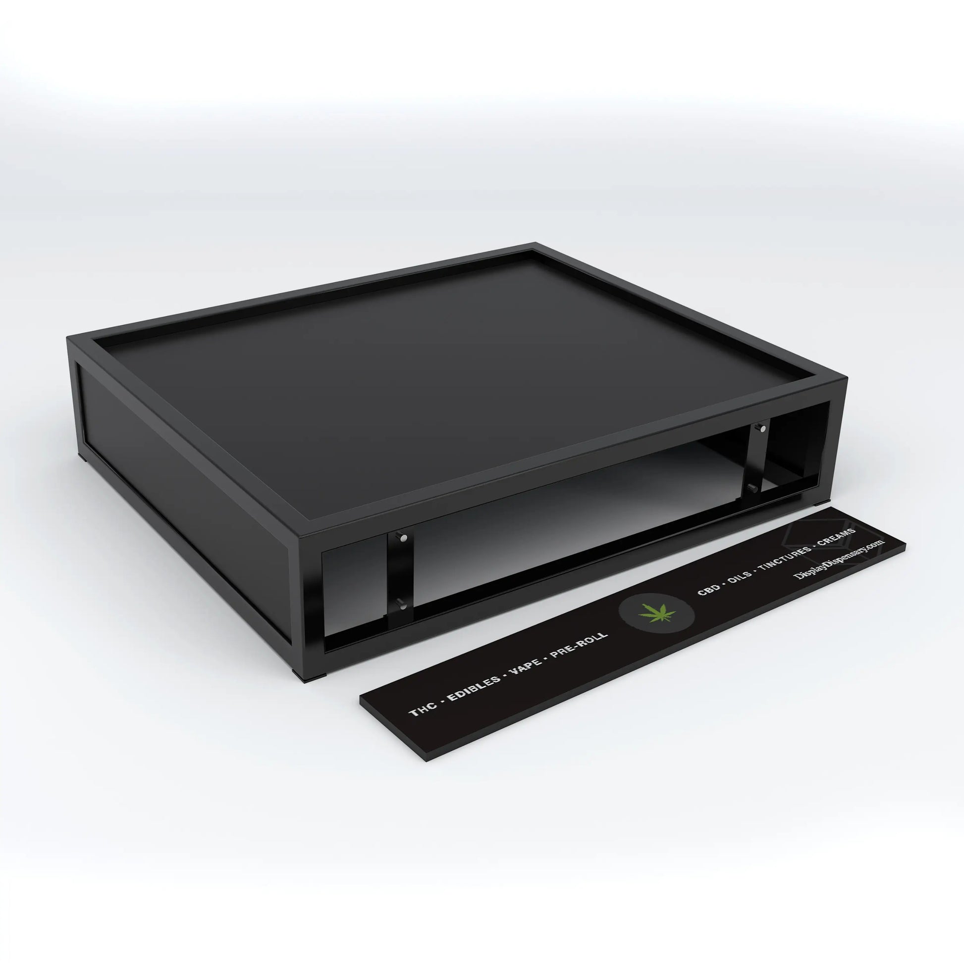 • Front panel is removable for you to easily customize with decals or silkscreened art work. Front panel is held in place with tiny magnets. Matte Black MDF panels are inset about 3/8”. The display riser measures 18” wide X 15” long x 4” high.
