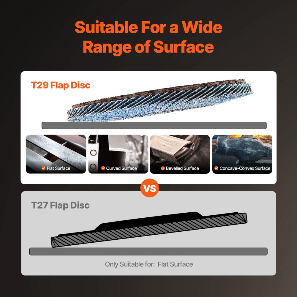 The thoughtfully designed 5° to 15° bevel allows for increased surface contact, providing optimal grinding performance These versatile flap discs excel in polishing metals, grinding wood, processing stone, maintaining vessels, handling composites, and finishing pipelines and containers Experience professional-grade results with each use!.