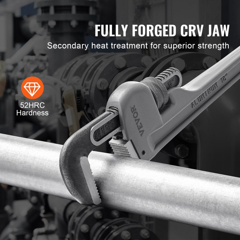 The VEVOR pipe wrench set offers three essential sizes: 10 inches, 14 inches, and 18 inches Crafted from lightweight aluminum, each wrench is 40% lighter than standard steel options, effectively minimizing fatigue during prolonged use The durable CRV alloy heads boast a hardness rating of 52 HRC, promising durability for a range of plumbing tasks, whether indoors or outdoors Designed with an ergonomic H-shaped handle, these tools ensure comfortable grip and efficient operation, minimizing hand strain.