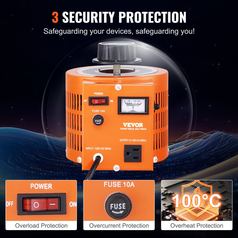 Introducing the VEVOR 1000VA auto-variable voltage transformer, an essential tool for effective power management Capable of delivering a maximum output of 1000VA, this transformer is ideal for a variety of applications Built for continuous use, it provides a reliable and stable power supply, making it suitable for residential, industrial, and office settings With an input capacity of 110V and an adjustable output range from 0V to 130V, this transformer allows for precise voltage adjustments to meet professional requirements.