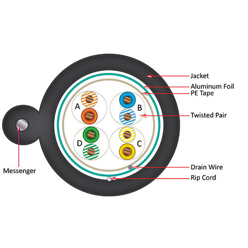 • Vertical Cable 059-498/S/MESG 24 CAT5E Solid BC Outdoor Rated Cable with Messenger 1000ft Pull Box Black.