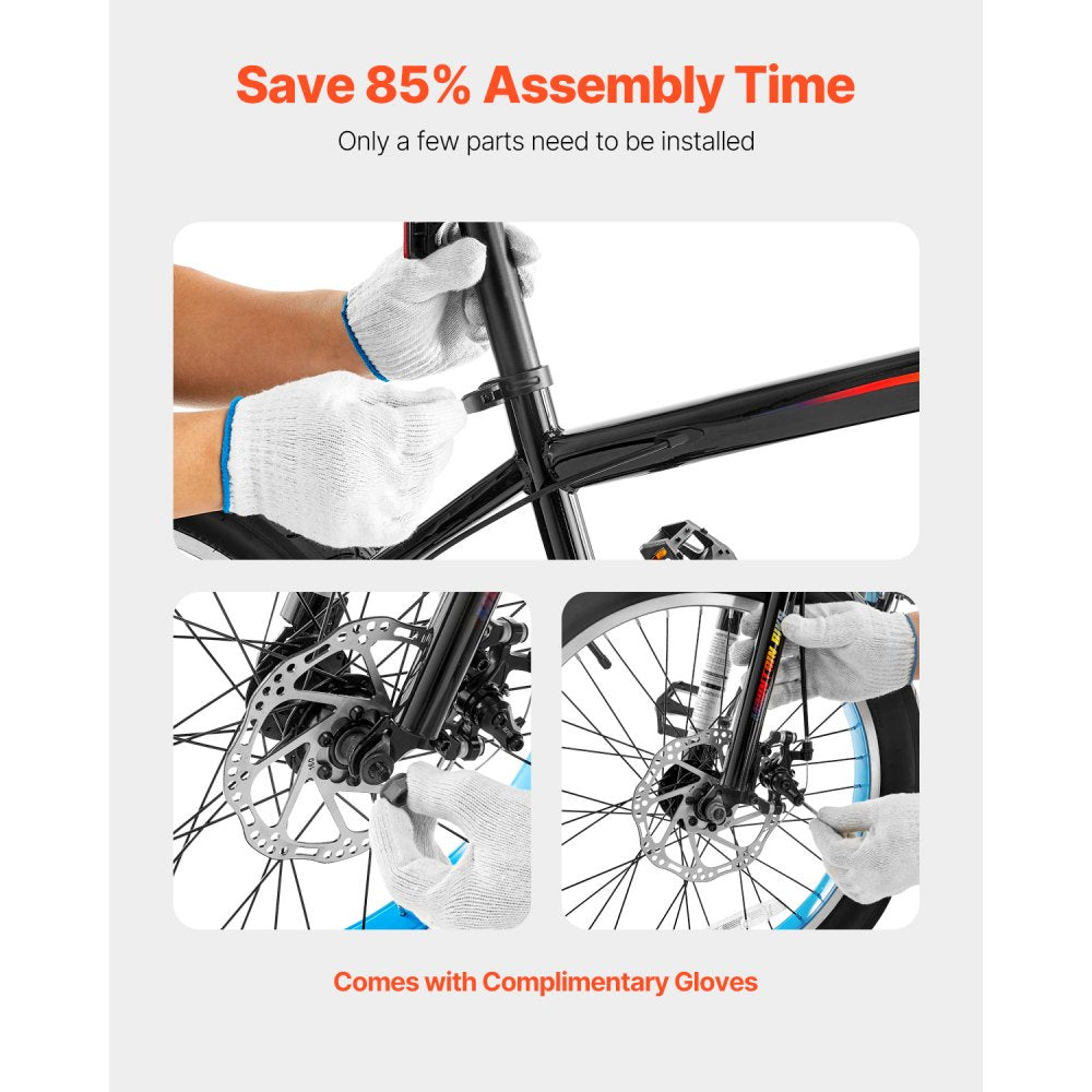 Additionally, this model incorporates dual disc brakes both in the front and rear, providing quick response and enhanced control for added safety during downhill rides or wet conditions This bike comes 85% pre-assembled and includes essential tools and gloves for straightforward assembly, letting your child hit the trails in no time.