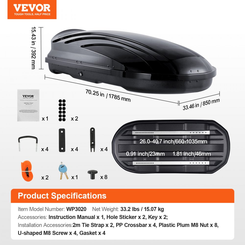 •11 cu.ft / 340 L Capacity: The rooftop cargo box maximizes roof space, providing extra spacious storage. It supports a max load of 165 lbs and includes two straps to securely fasten items inside, meeting diverse storage needs..