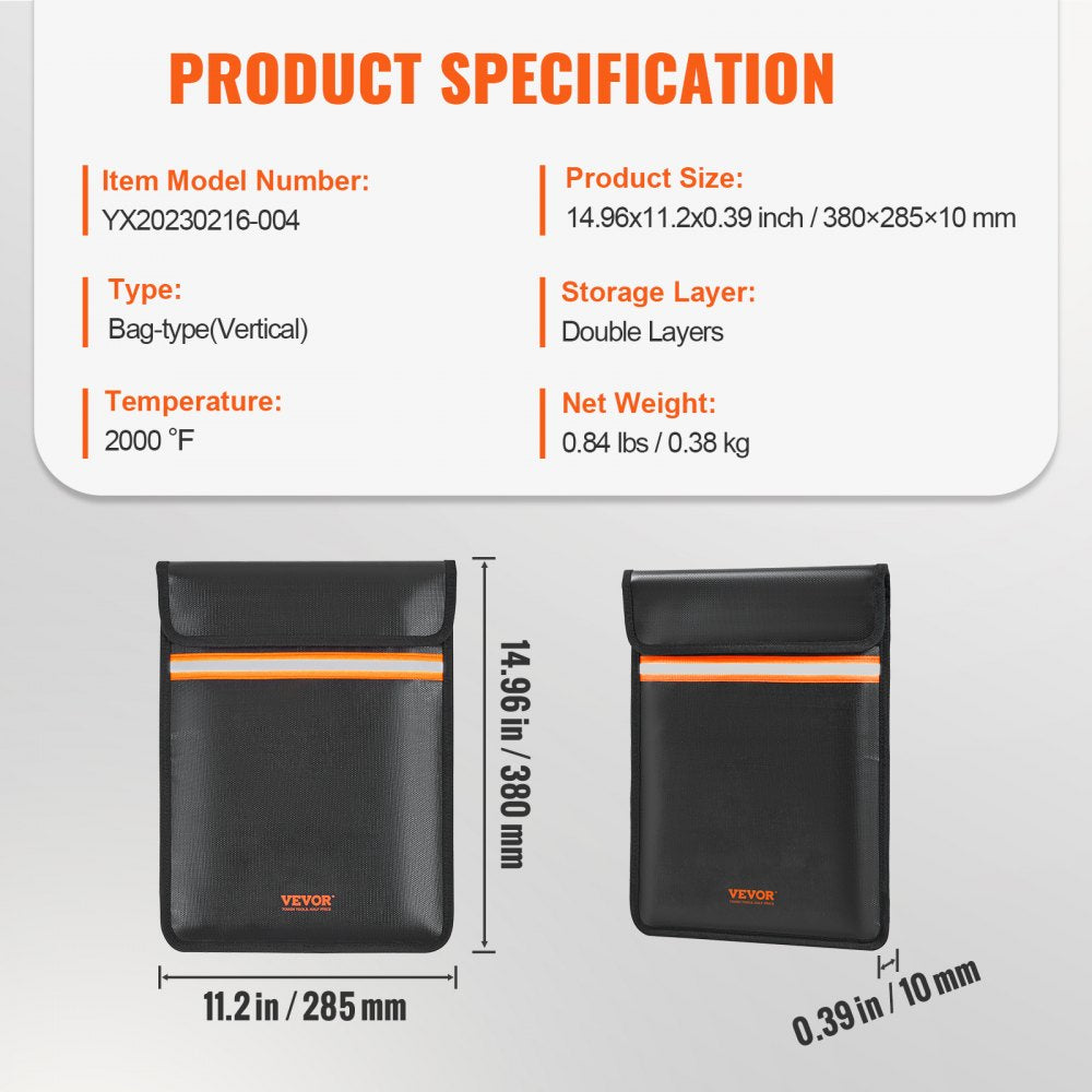 Ensure the safety of your essential documents with the VEVOR fireproof document bag, crafted to endure extreme temperatures of up to 2000°F Its double-layer fiberglass structure combined with a non-itchy silicone coating provides robust protection for your valuables This versatile bag accommodates vital items such as passports, ID cards, and contracts, while its waterproof feature shields against unexpected splashes.