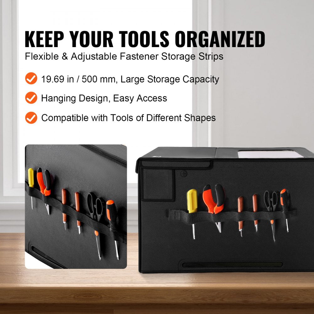 •Ample storage space with adjustable fastener strips for various tool shapes.