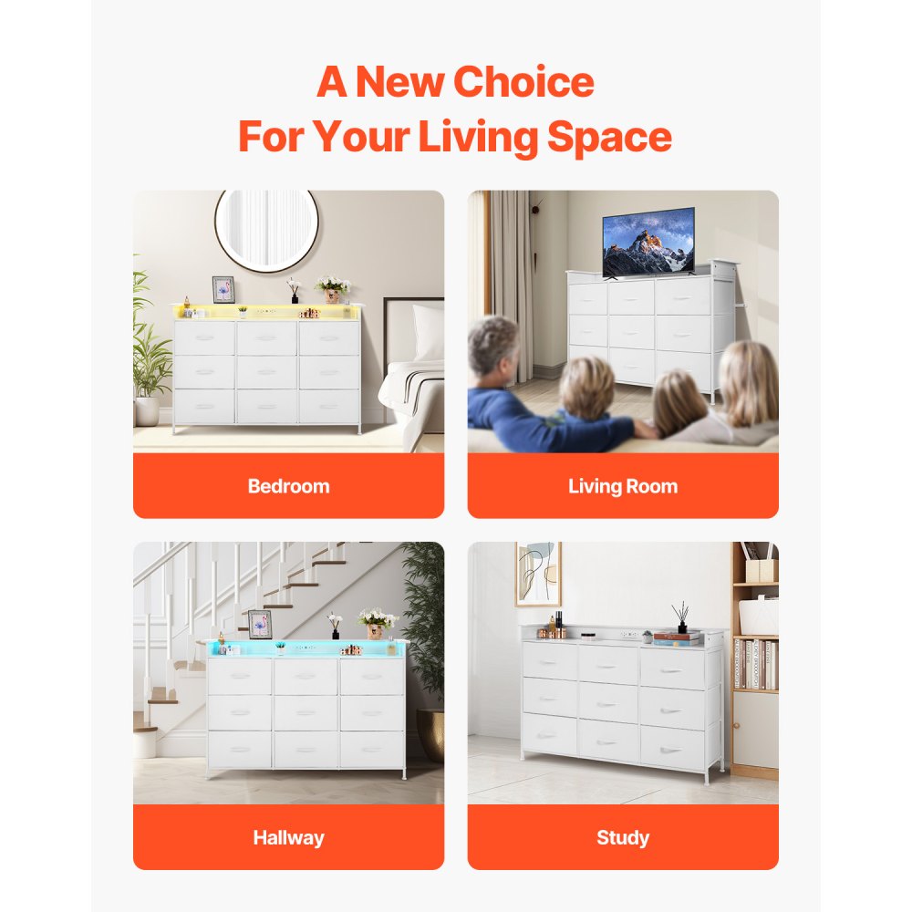 Elevate your living area with this stylish fabric drawer dresser, which combines functionality with modern aesthetics Featuring an expansive top surface ideal for holding a TV, it doubles as a chic storage unit The built-in RGB LED lights can be easily controlled via remote, allowing you to adjust brightness and choose from a spectrum of colors to set the mood With nine roomy drawers, this unit is perfect for organizing your belongings while keeping your home clutter-free—making it versatile enough for bedrooms, hallways, and closets alike.