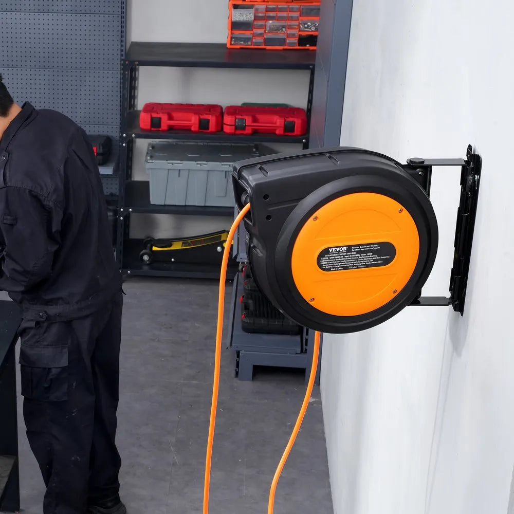 Experience effortless power management with the VEVOR Retractable Extension Cord Reel This innovative reel boasts a generous 75-foot extension cord along with a 45-foot lead-in cord, all featuring an automatic retracting function for ease of use Safety is paramount, so it includes a 13A circuit breaker Crafted from high-quality 14AWG/3C SJTOW cable, this extension cord is designed to withstand harsh conditions, making it resistant to water and oil—ideal for outdoor settings.