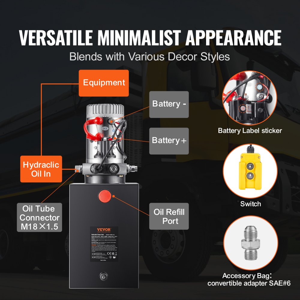 Experience the power of the VEVOR hydraulic pump, equipped with a robust 12V DC motor delivering an impressive 16kW performance This single-acting power unit is designed for reliable lifting of heavy items such as cars, thanks to its substantial 12-quart fluid capacity Operating at a high flow rate of 091 GPM, it achieves a maximum pressure of 3200 PSI, making it an excellent choice for both personal projects and commercial applications.
